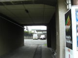 手前に見える赤茶色のビルの自販機の手前をくぐって