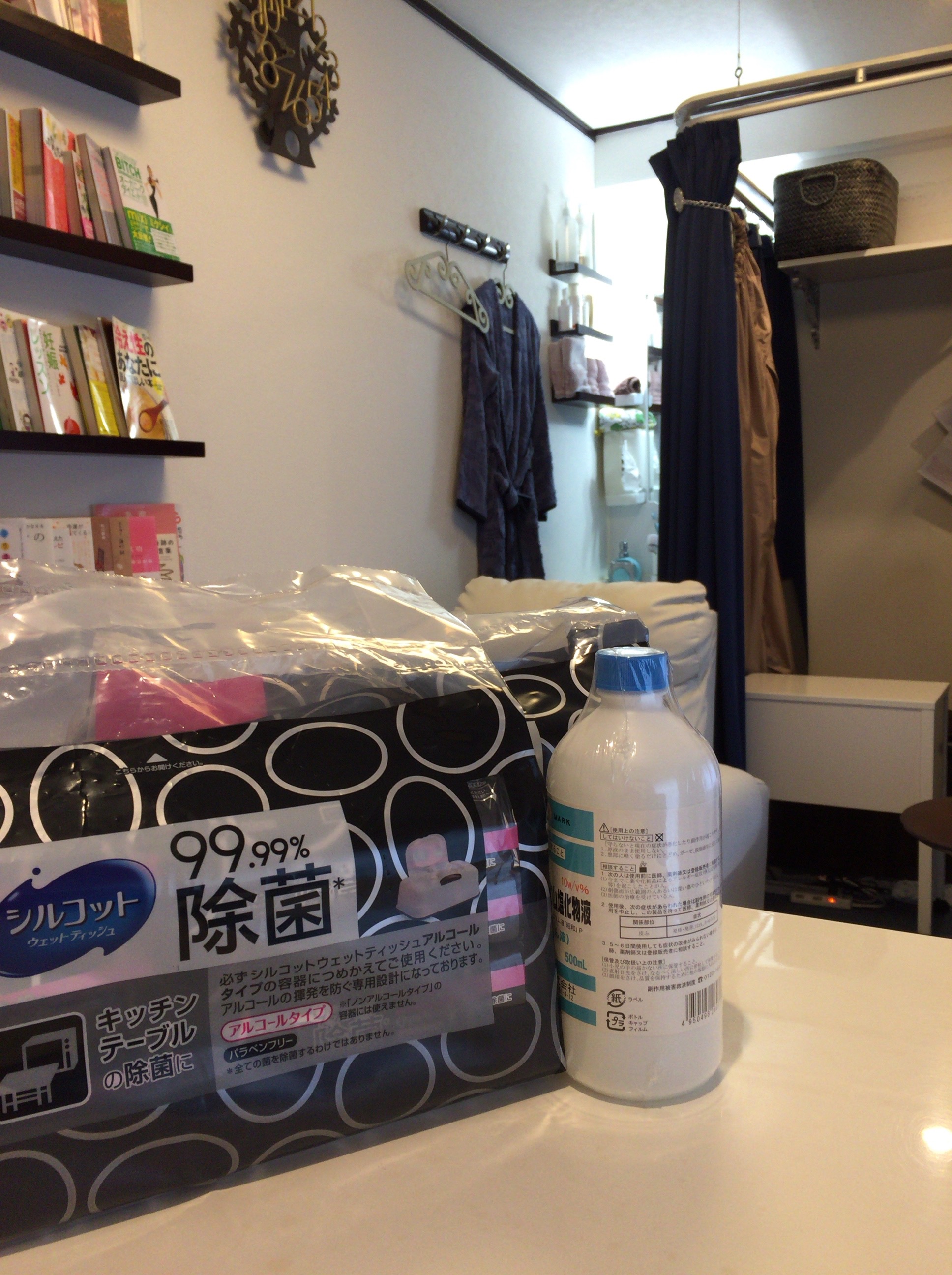 99.99%除菌シートで拭き上げ、医療機関で使用されている消毒液を散布します。