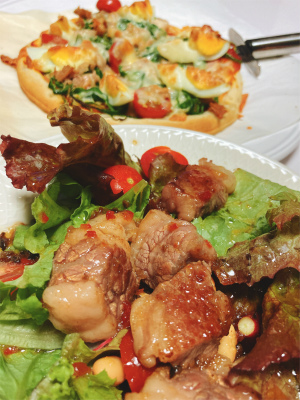焼肉サラダとピザ。