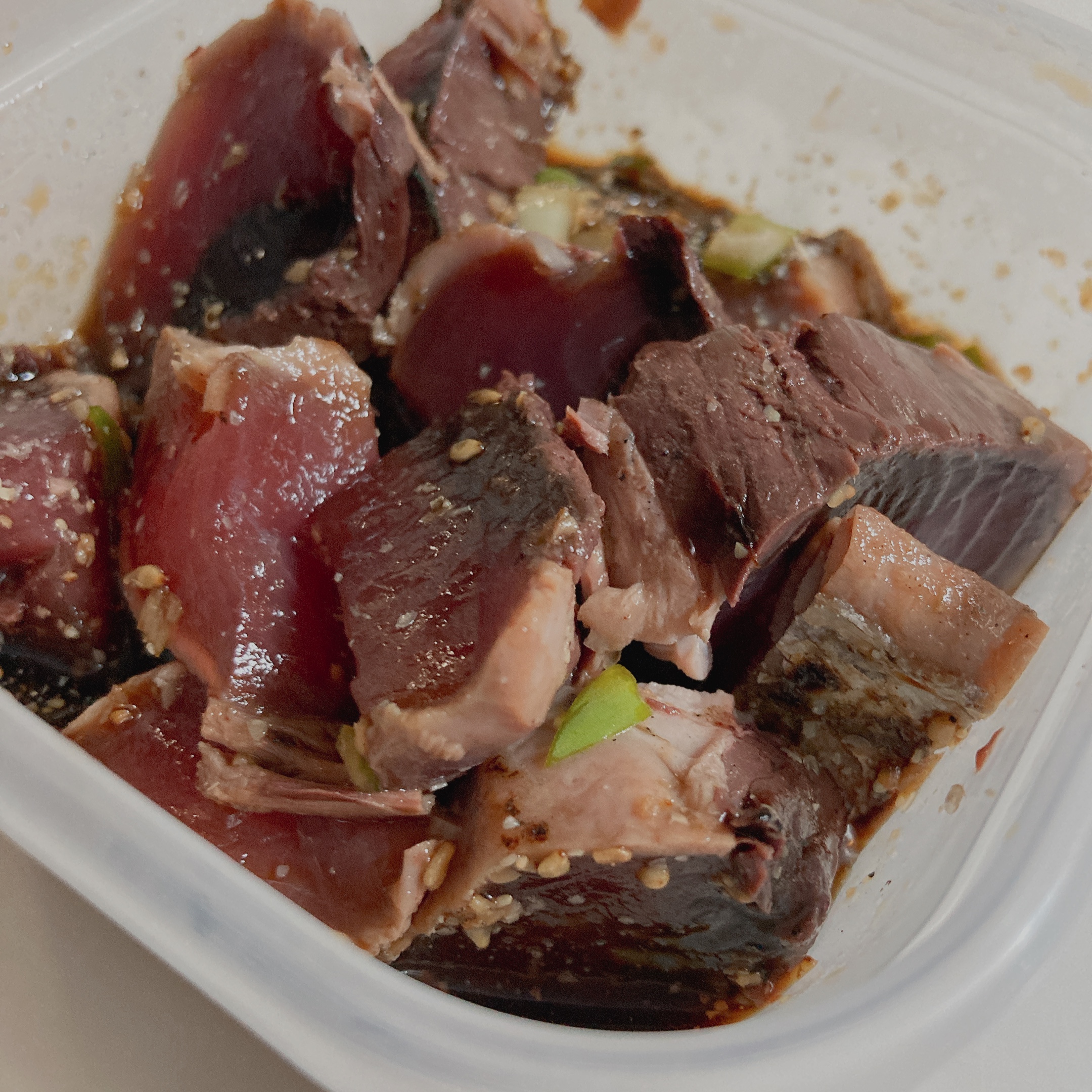 カツオをニンニク醤油に漬けまして