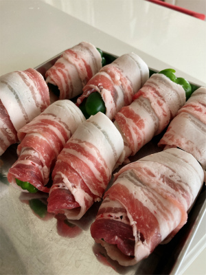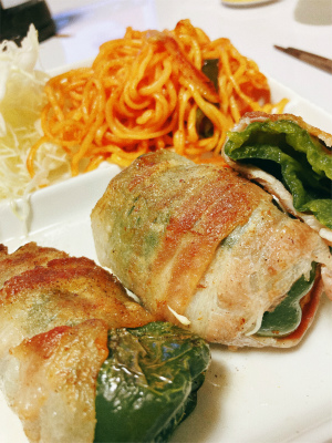 頂いたピーマンに豚肉を巻きまして