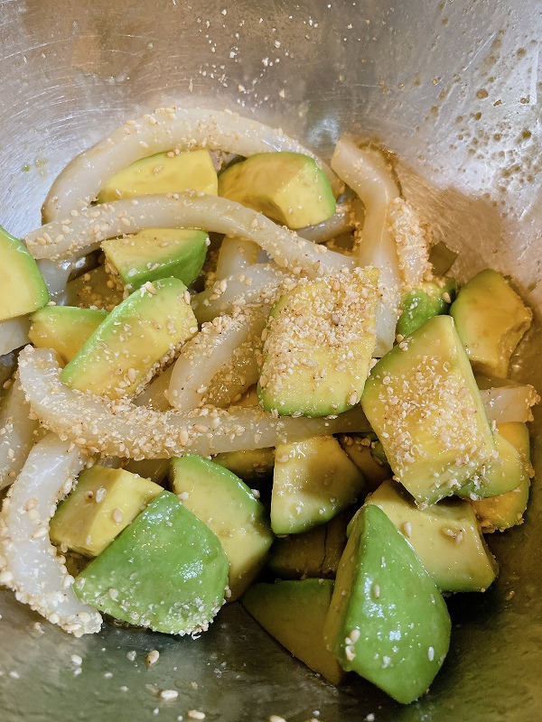 イカのお刺身とすりごま、久原のダシと和えました。